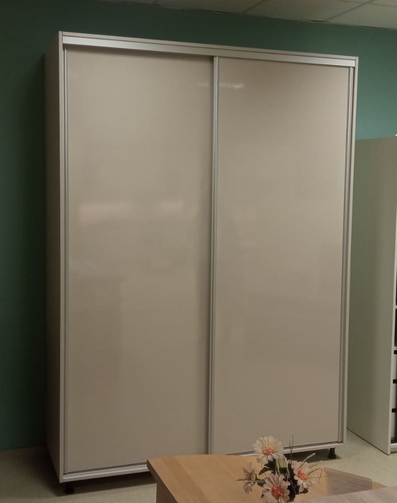 Provedení lamino béžové, dveře lesklé, pravá část sklopná tyč + police, levá část šatní + 2 police. šířka 175 cm, hl. 65 cm, v. 245 cm